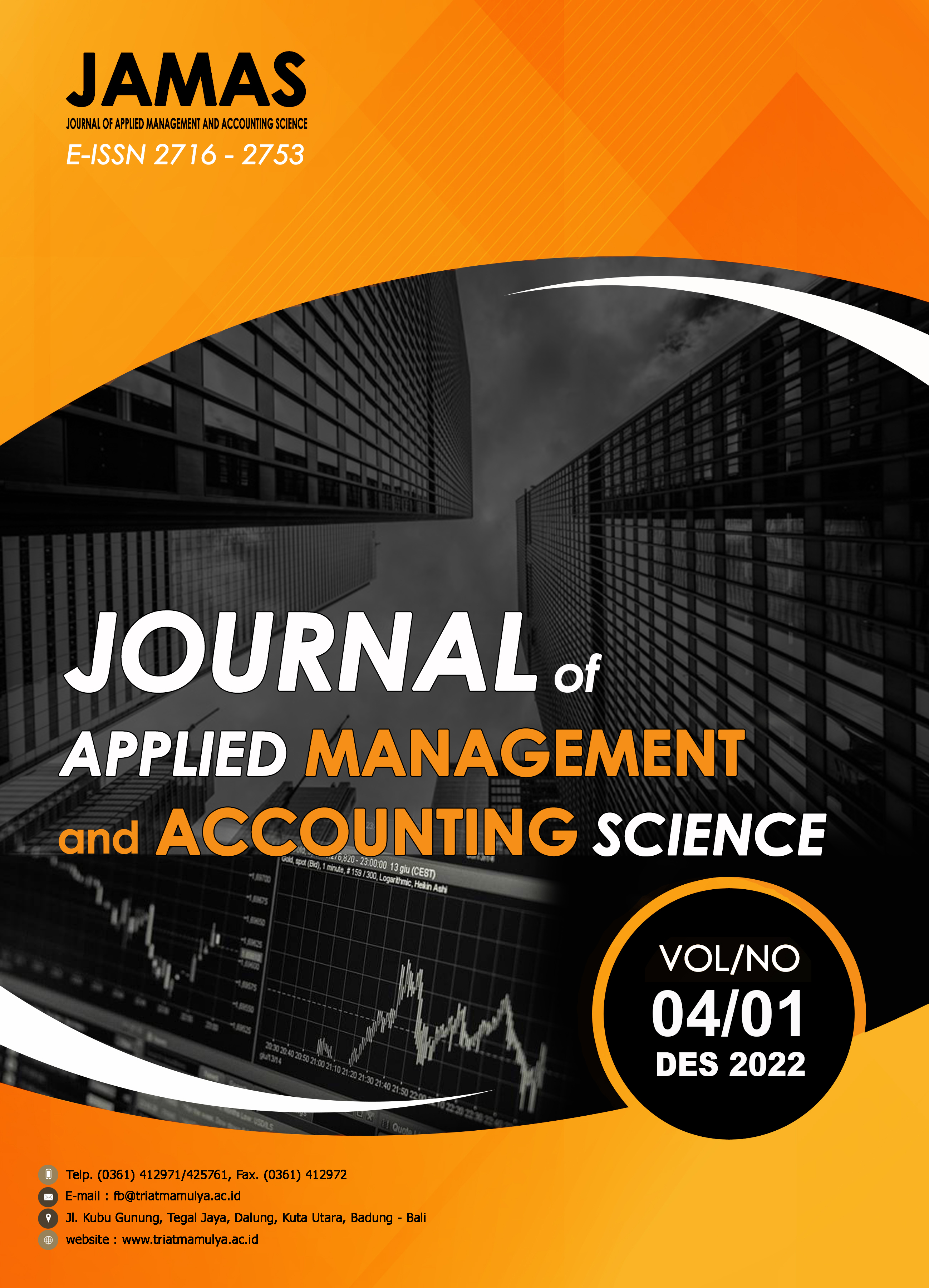 Vol. 5 No. 1 (2023)Journal of Applied Management and Accounting Science (JAMAS) is an e-Journal that is published twice a year to accommodate researchers in publishing research results, especially in the fields of management and accounting. Journal of Applied Management and Accounting Science (JAMAS) was first published in Badung in 2019 by the Business Faculty, Triatma Mulya University, Bali - Indonesia. Based on the ISSN National Center Issuance Decree (International Standard Serial Number) for Indonesia based in Paris No. : 0005.27162753 / JI.3.1 / SK.ISSN / 2020.01 Jakarta, January 30, 2020 has been declared to have ISSN (International Standard Serial Number) number 2716-2753 (online media). Journal of Applied Management and Accounting Science (JAMAS) has been declared a SINTA rank 5 based on Certificate of Scientific Journal Accreditation Ranking Period 2 of 2021 Number 164/E/KPT/2021 dated December 27, 2021. Journal of Applied Management and Accounting Science (JAMAS) accepts submissions of original articles that have not been published elsewhere nor being considered or processed for publication anywhere, and demonstrate no plagiarism whatsoever. The prerequisites, standards, and format of the manuscript are listed in the author guidelines and templates. Any accepted manuscript will be reviewed by at least two referees. Authors should follow throughout the whole process including article submission, review and editing process, and publication.